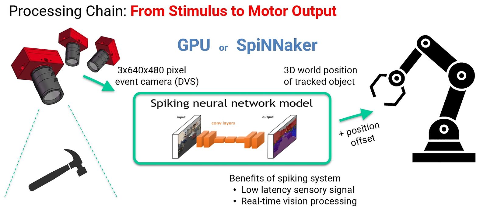 We train spiking neural networks (SNN) to process the incoming camera data in real time; thereby allowing low-latency responses.
